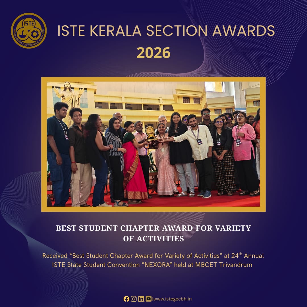 ISTE SC GECBH๐ has been honored with the Best Student Chapter with Variety of Activities Award at the 23rd Annual ISTE State Convention โ Ignifex held at GEC Kozhikode, for the academic year 2023โ24. A heartfelt thank you to everyone for your unwavering support and cooperation.