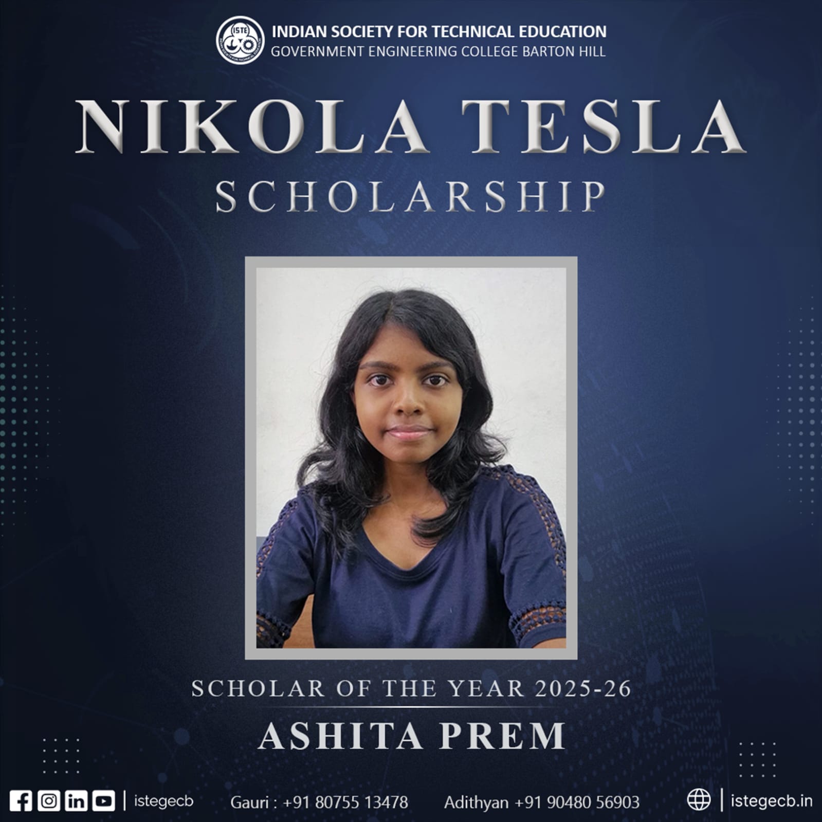๐ซโจ ISTE SC GECBH is thrilled to announce Muhammed Swalih Haneef of S2 ECE as the Nikola Tesla Scholar ๐ of the Year 2024-25 โจ๐ซ