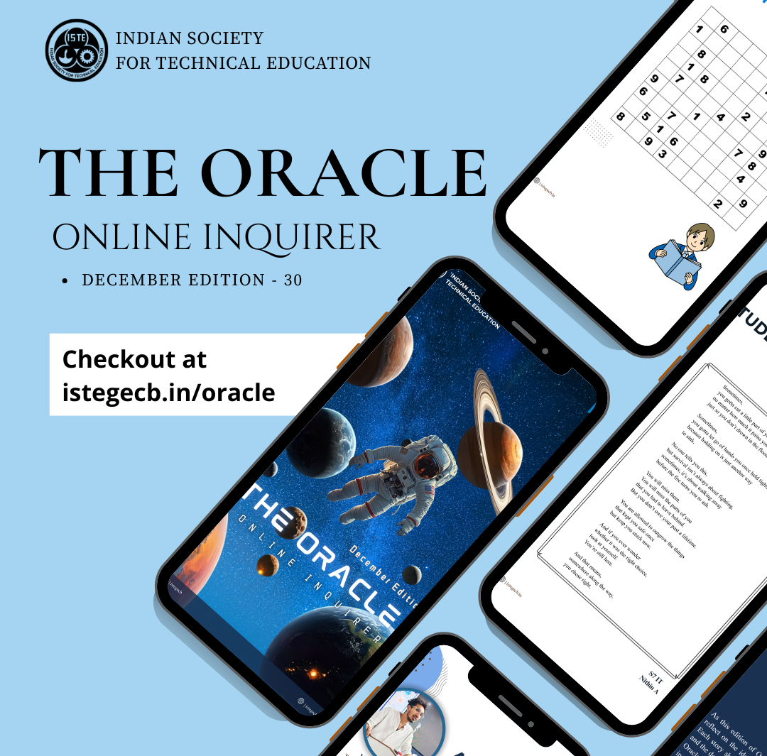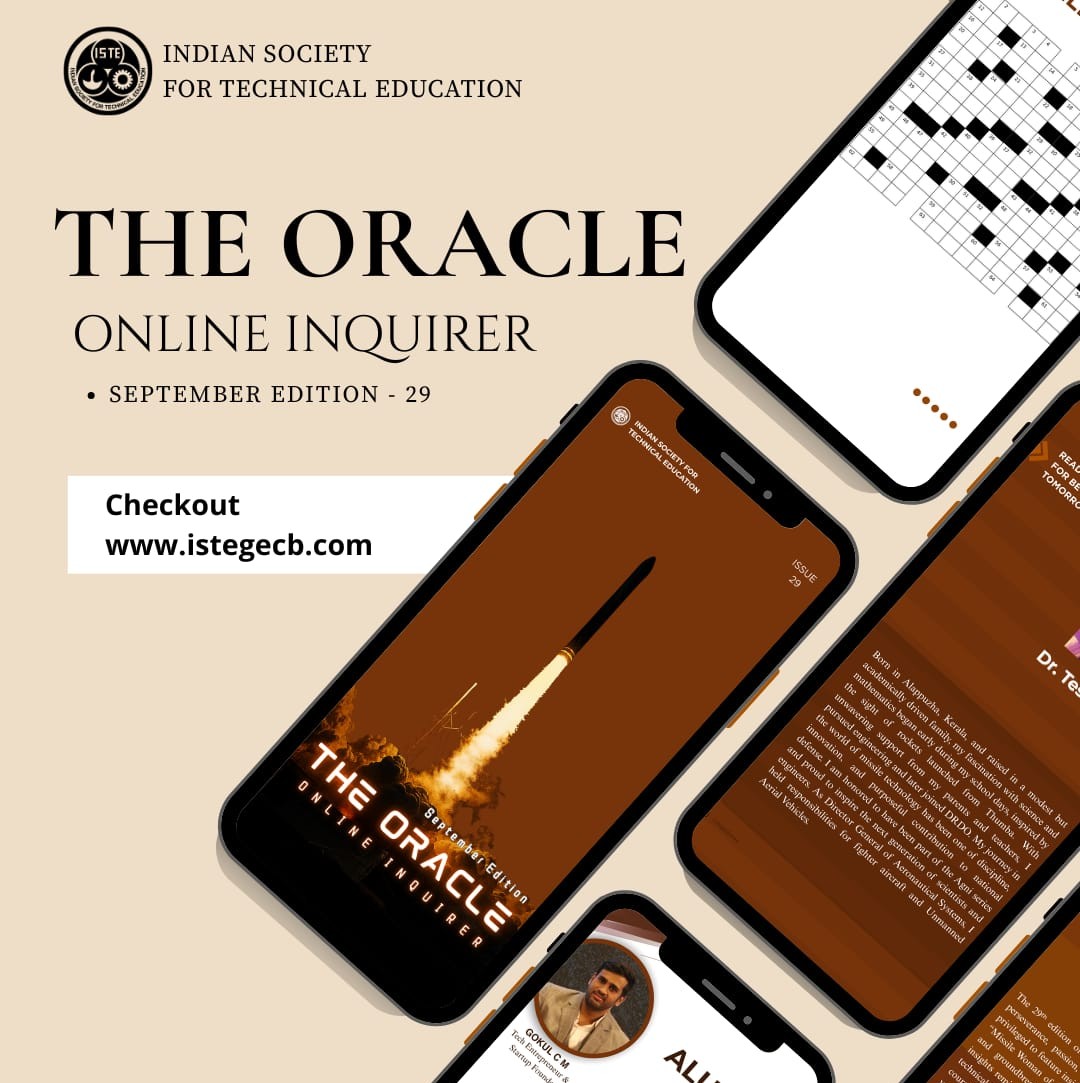 Oracle,an online inquirer newsletter released every month features students' queries to accomplished personalities, institutes or organisations. Previous editions were of prominent personalities like Dr E Sreedharan - The Metroman, Dr P M Ajayan in field of nanotechnology, Prof V K Damodaran and many more.The basic idea behind this newsletter is to provide our student chapter members with the academic knowledge and they can remain updated with the monthly current affairs through different sections of this newsletter. Sections like games, fun facts and puzzles have been added for fun.
